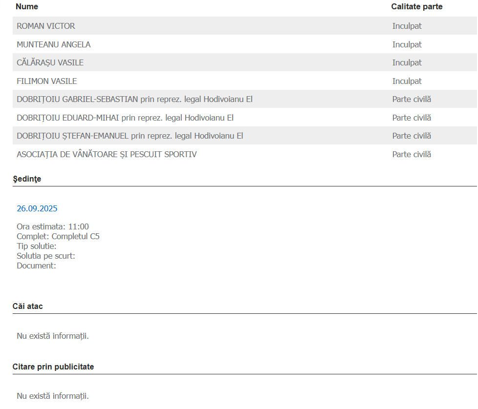 Potrivit portalului instanțelor de judecată (dosar nr. 2067/275/2025/a1), pe banca acuzaților se vor afla patru inculpați: fostul deputat și consilier județean Victor Roman, Angela Munteanu, Vasile Călărașu și Vasile Filimon. Partea civilă este reprezentată de familia victimei – trei copii minori, alături de Asociația de Vânătoare și Pescuit Sportiv.